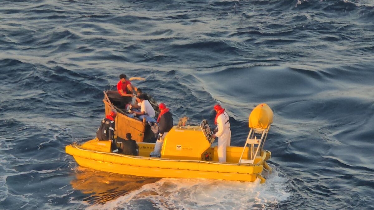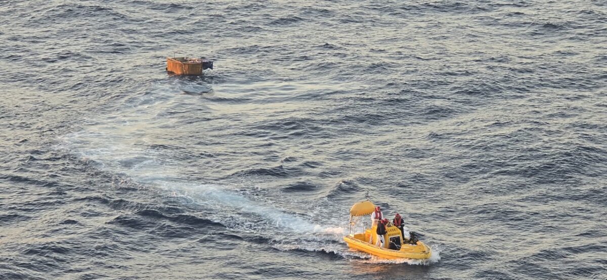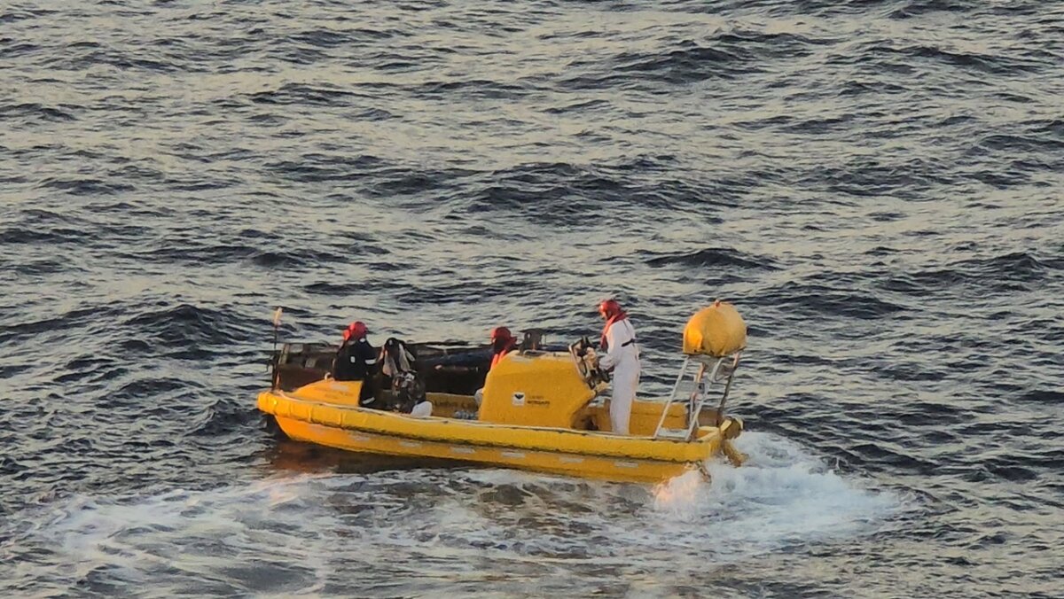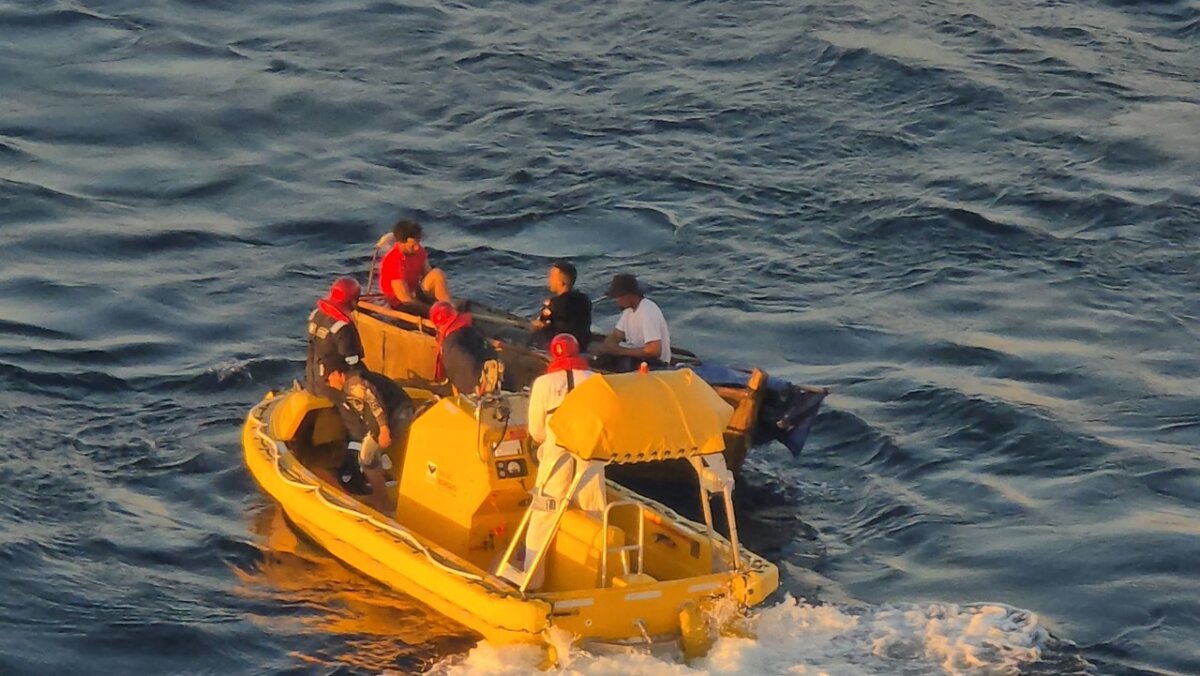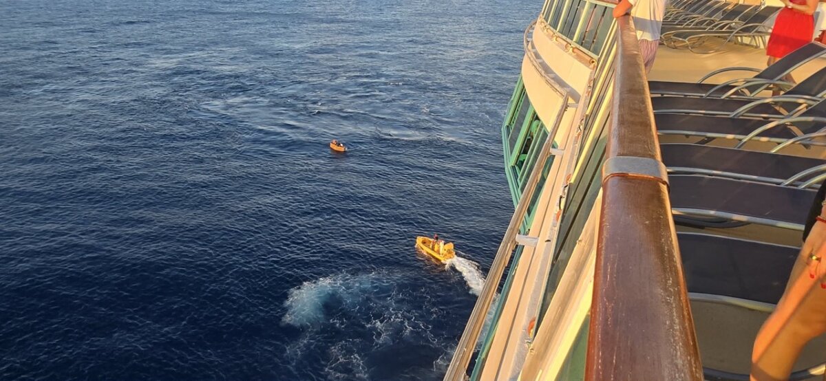 Photos shared by Hoglander show the six individuals crowded into a small, open craft drifting in open waters. The ship’s crew appears to be coordinating the rescue from a safe distance as they carefully bring the individuals on board Radiance of the Seas.