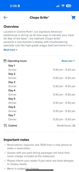 However, there are early indications that it may not be isolated. For my upcoming sailing on Star of the Seas, Chops Grille currently only shows dinner reservations available for purchase, with no lunch option listed. There is no lunch menu provided in the app either.
