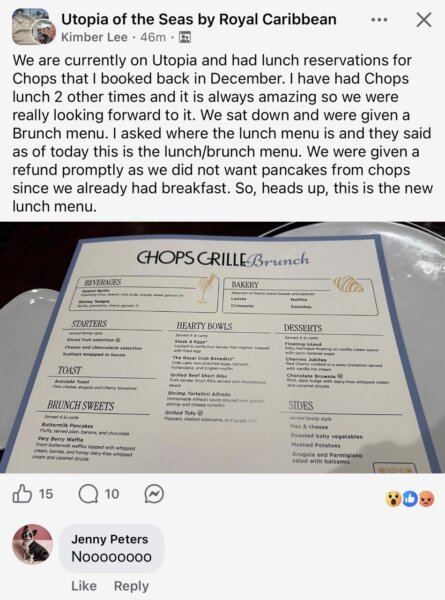 “We are currently on Utopia and had lunch reservations for Chops that I booked back in December. I have had Chops lunch 2 other times and it is always amazing so we were really looking forward to it.